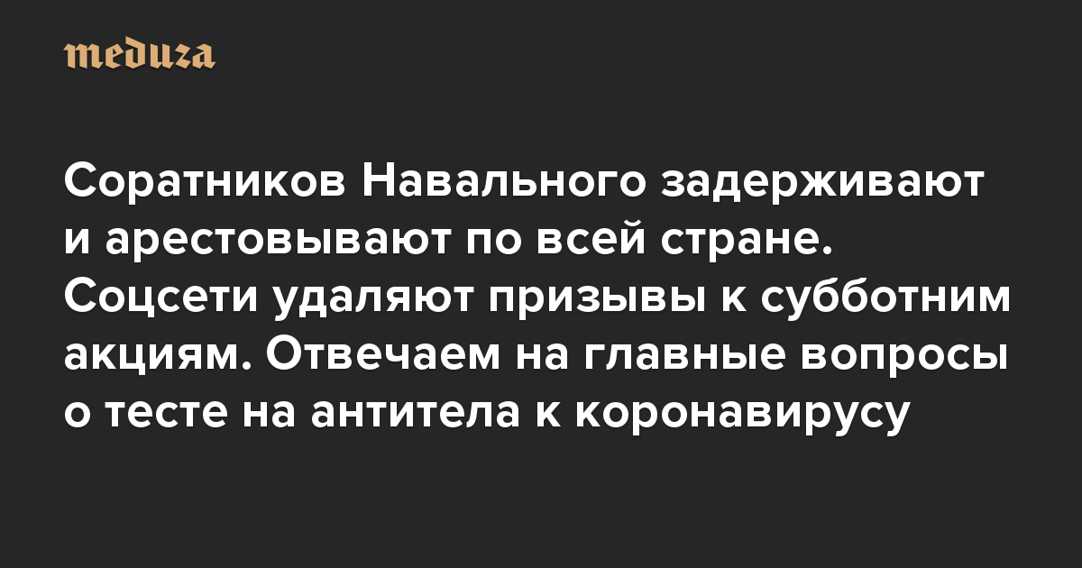 Вечерняя Медуза Соратников Навального задерживают и арестовывают по всей стране. Соцсети удаляют призывы к субботним акциям. Отвечаем на главные вопросы о тесте на антитела к коронавирусу