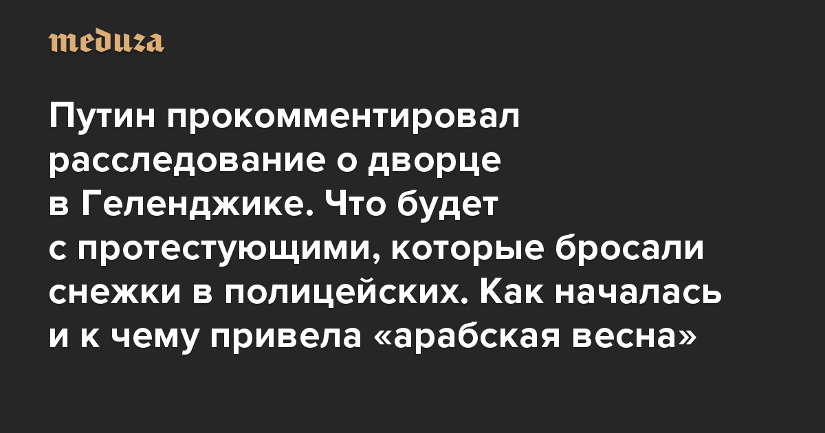 Вечерняя Медуза Путин прокомментировал расследование о дворце в Геленджике. Что будет с протестующими, которые бросали снежки в полицейских. Как началась и к чему привела «арабская весна»