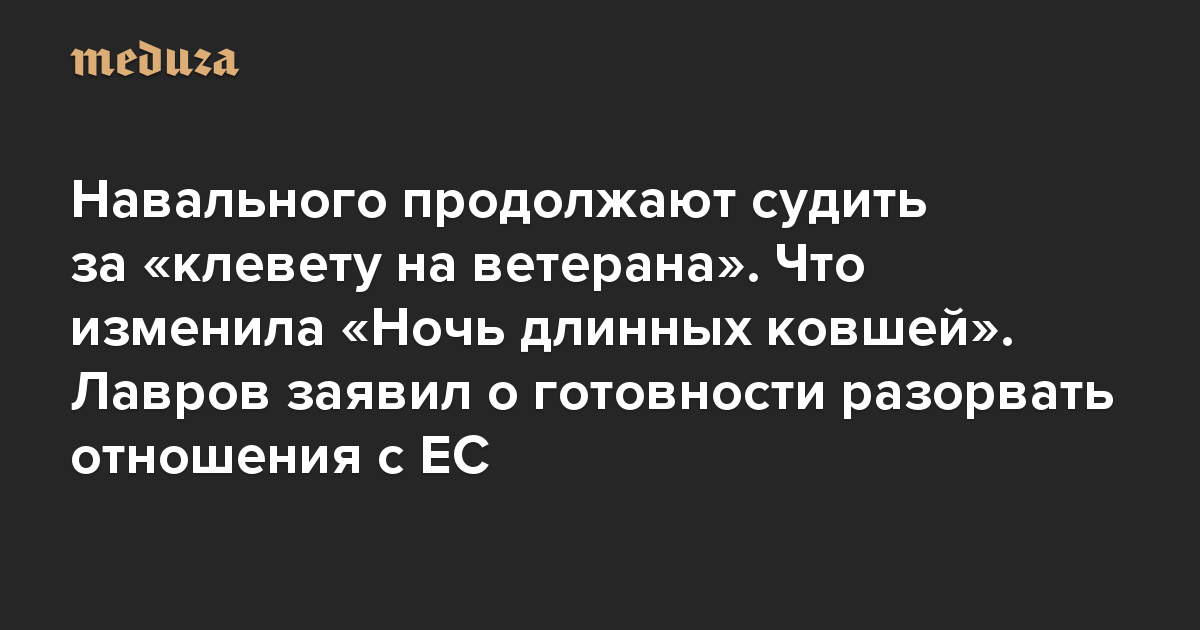Вечерняя Медуза Навального продолжают судить за «клевету на ветерана». Что изменила «Ночь длинных ковшей». Лавров заявил о готовности разорвать отношения с ЕС