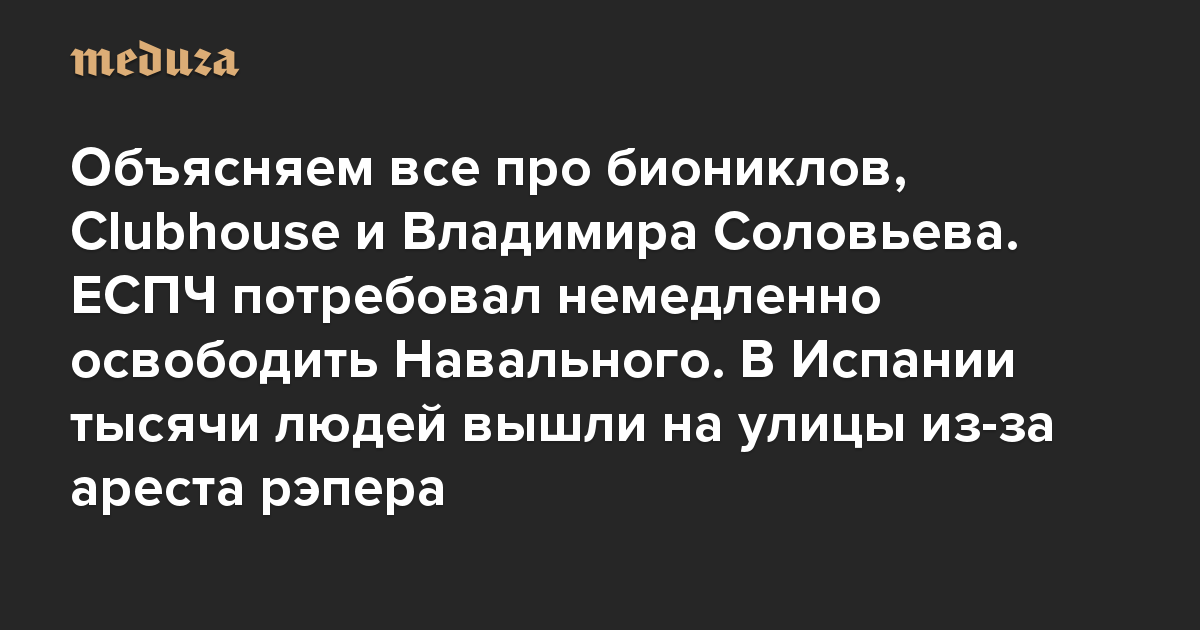 Вечерняя Медуза Объясняем все про биониклов, Clubhouse и Владимира Соловьева. ЕСПЧ потребовал немедленно освободить Навального. В Испании тысячи людей вышли на улицы из-за ареста рэпера