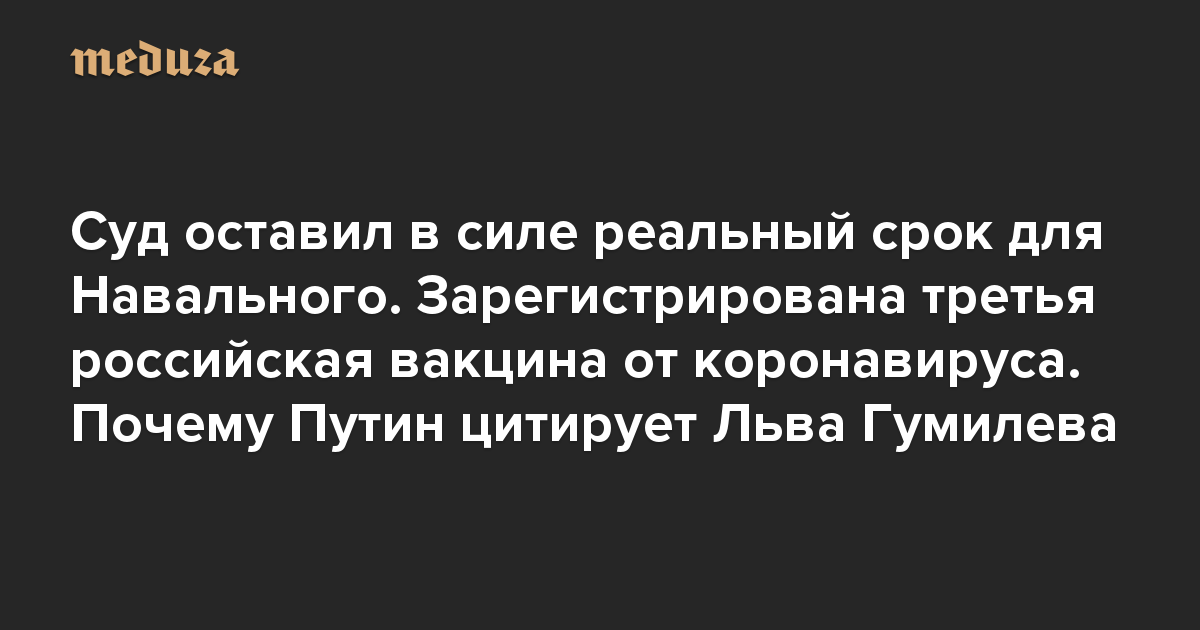 Вечерняя Медуза Суд оставил в силе реальный срок для Навального. Зарегистрирована третья российская вакцина от коронавируса. Почему Путин цитирует Льва Гумилева