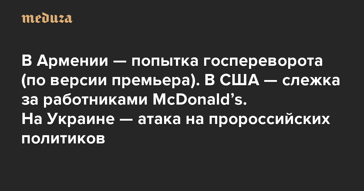 Вечерняя Медуза В Армении — попытка госпереворота (по версии премьера). В США — слежка за работниками McDonaldʼs. На Украине — атака на пророссийских политиков