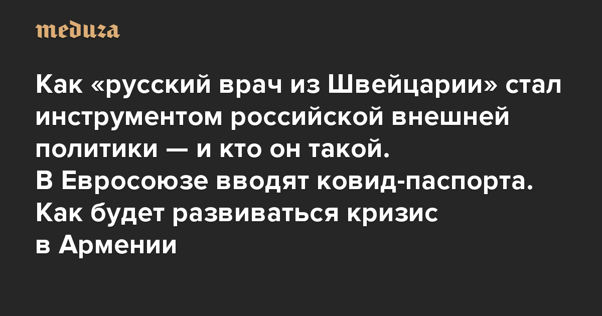 Вечерняя Медуза Как «русский врач из Швейцарии» стал инструментом российской внешней политики — и кто он такой. В Евросоюзе вводят ковид-паспорта. Как будет развиваться кризис в Армении