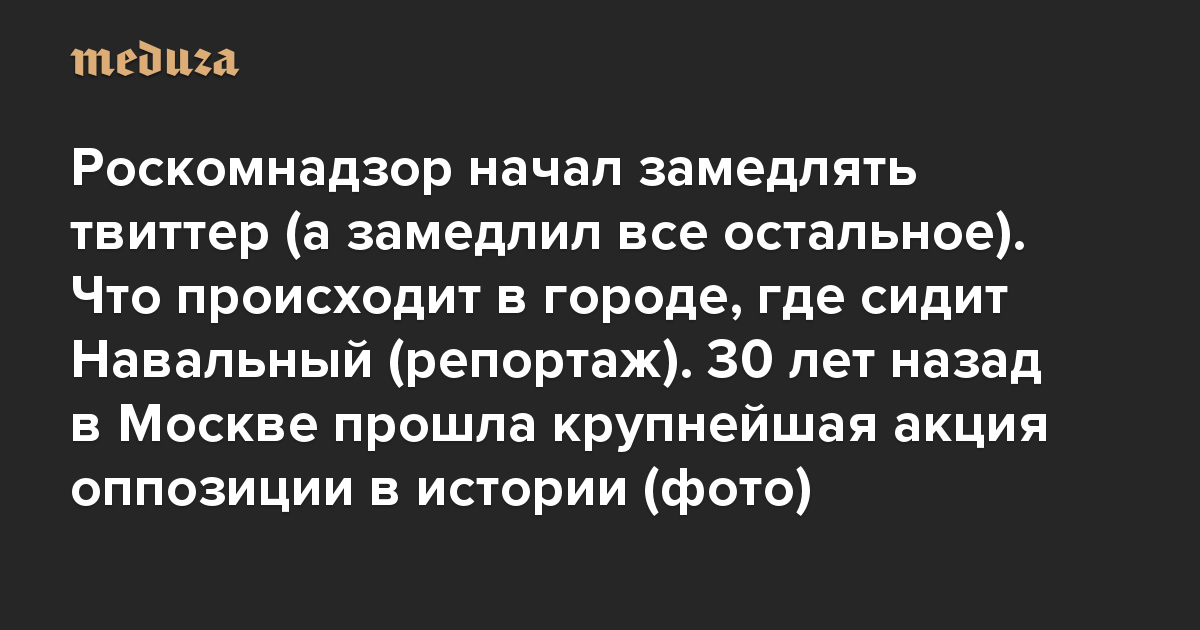 Вечерняя Медуза Роскомнадзор начал замедлять твиттер (а замедлил все остальное). Что происходит в городе, где сидит Навальный (репортаж). 30 лет назад в Москве прошла крупнейшая акция оппозиции в истории (фото)