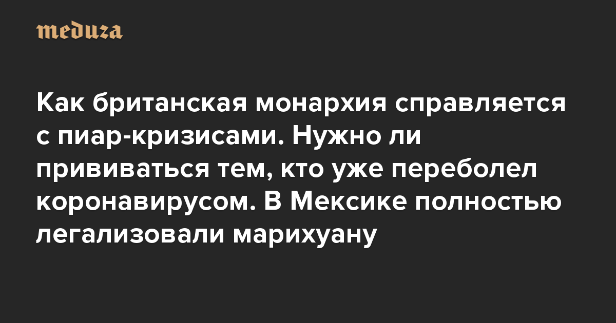 Вечерняя Медуза Как британская монархия справляется с пиар-кризисами. Нужно ли прививаться тем, кто уже переболел коронавирусом. В Мексике полностью легализовали марихуану