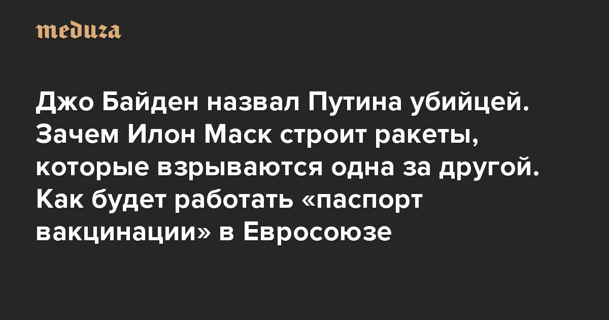 Вечерняя Медуза Джо Байден назвал Путина убийцей. Зачем Илон Маск строит ракеты, которые взрываются одна за другой. Как будет работать «паспорт вакцинации» в Евросоюзе