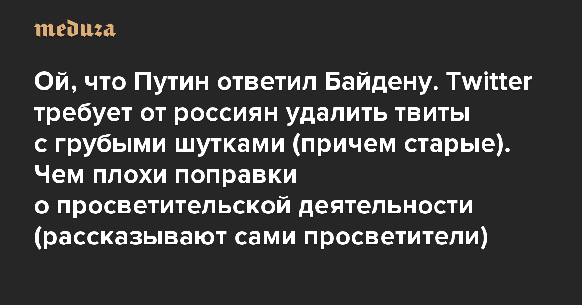 Вечерняя Медуза Ой, что Путин ответил Байдену. Twitter требует от россиян удалить твиты с грубыми шутками (причем старые). Чем плохи поправки о просветительской деятельности (рассказывают сами просветители)