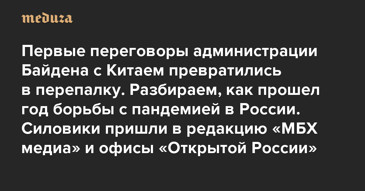 Вечерняя Медуза Первые переговоры администрации Байдена с Китаем превратились в перепалку. Разбираем, как прошел год борьбы с пандемией в России. Силовики пришли в редакцию «МБХ медиа» и офисы «Открытой России»