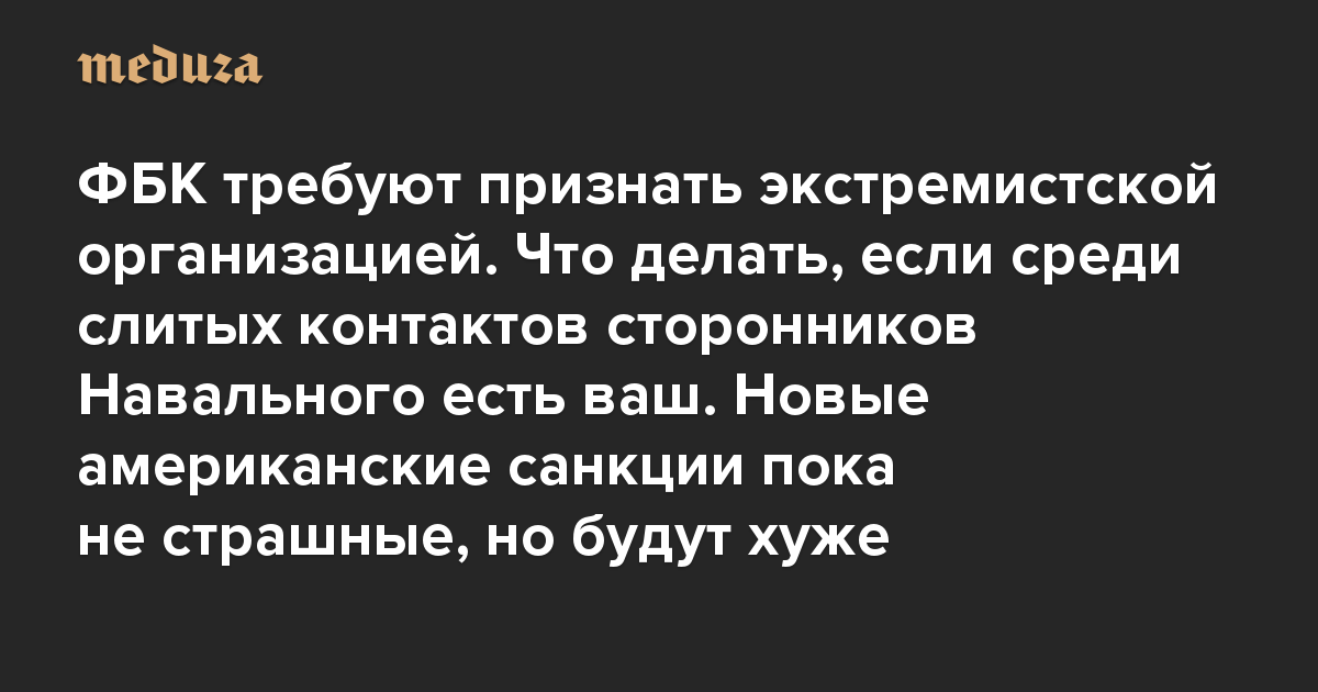 Вечерняя Медуза ФБК требуют признать экстремистской организацией. Что делать, если среди слитых контактов сторонников Навального есть ваш. Новые американские санкции пока не страшные, но будут хуже