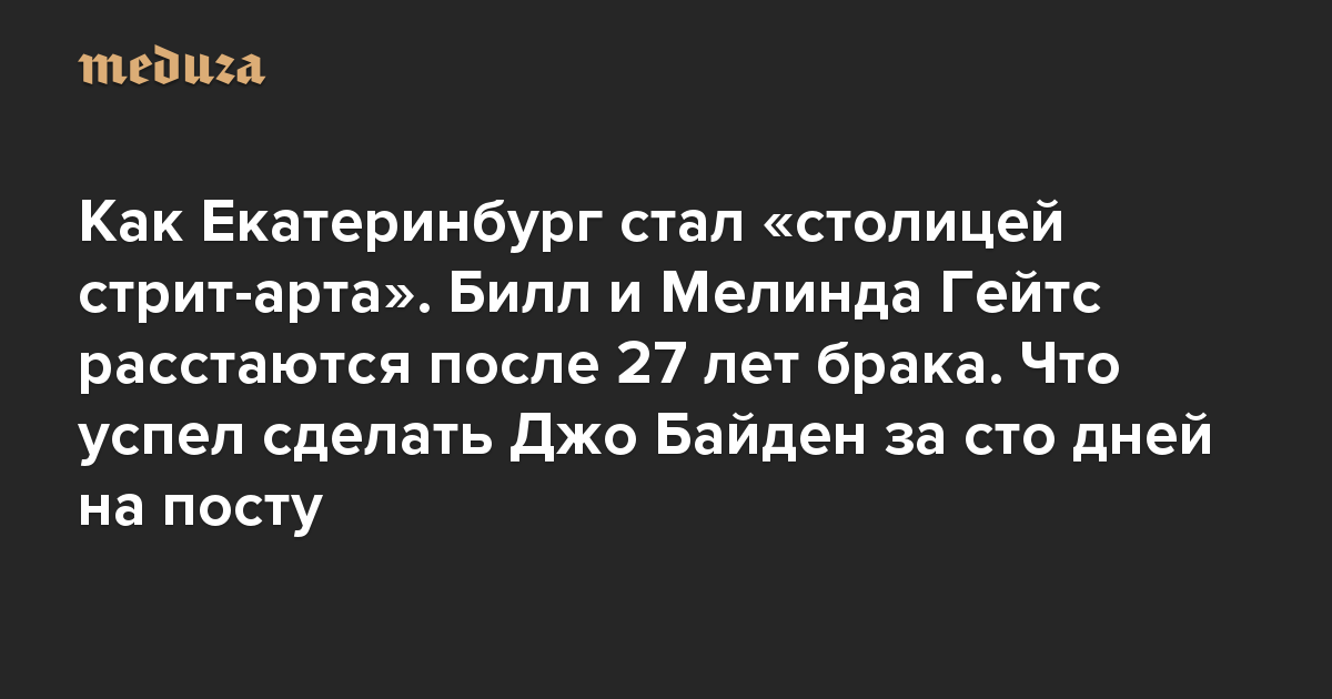 Вечерняя Медуза Как Екатеринбург стал «столицей стрит-арта». Билл и Мелинда Гейтс расстаются после 27 лет брака. Что успел сделать Джо Байден за сто дней на посту