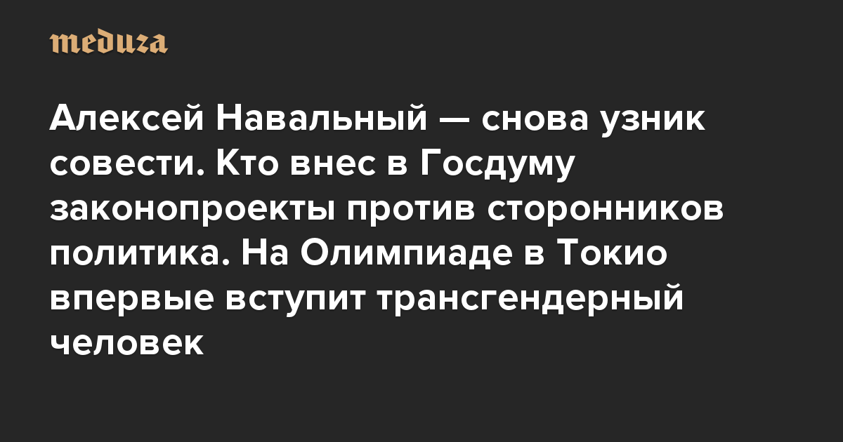 Вечерняя Медуза Алексей Навальный — снова узник совести. Кто внес в Госдуму законопроекты против сторонников политика. На Олимпиаде в Токио впервые вступит трансгендерный человек