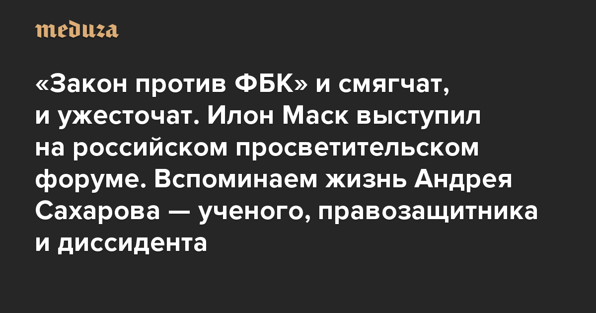 Вечерняя Медуза «Закон против ФБК» и смягчат, и ужесточат. Илон Маск выступил на российском просветительском форуме. Вспоминаем жизнь Андрея Сахарова — ученого, правозащитника и диссидента