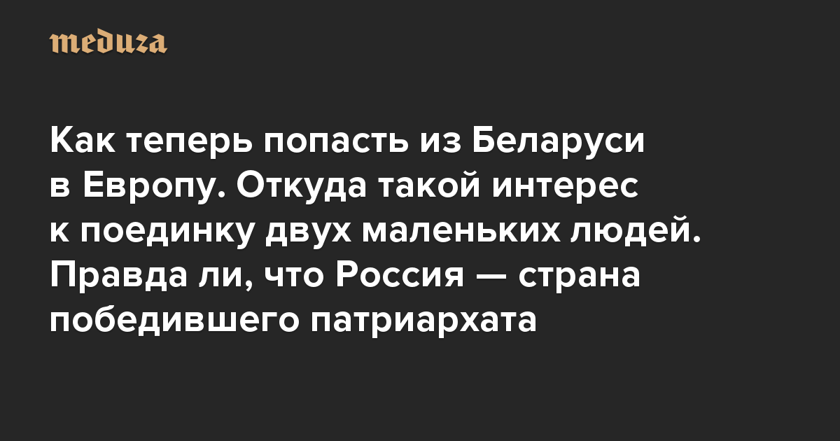 Вечерняя Медуза Как теперь попасть из Беларуси в Европу. Откуда такой интерес к поединку двух маленьких людей. Правда ли, что Россия — страна победившего патриархата