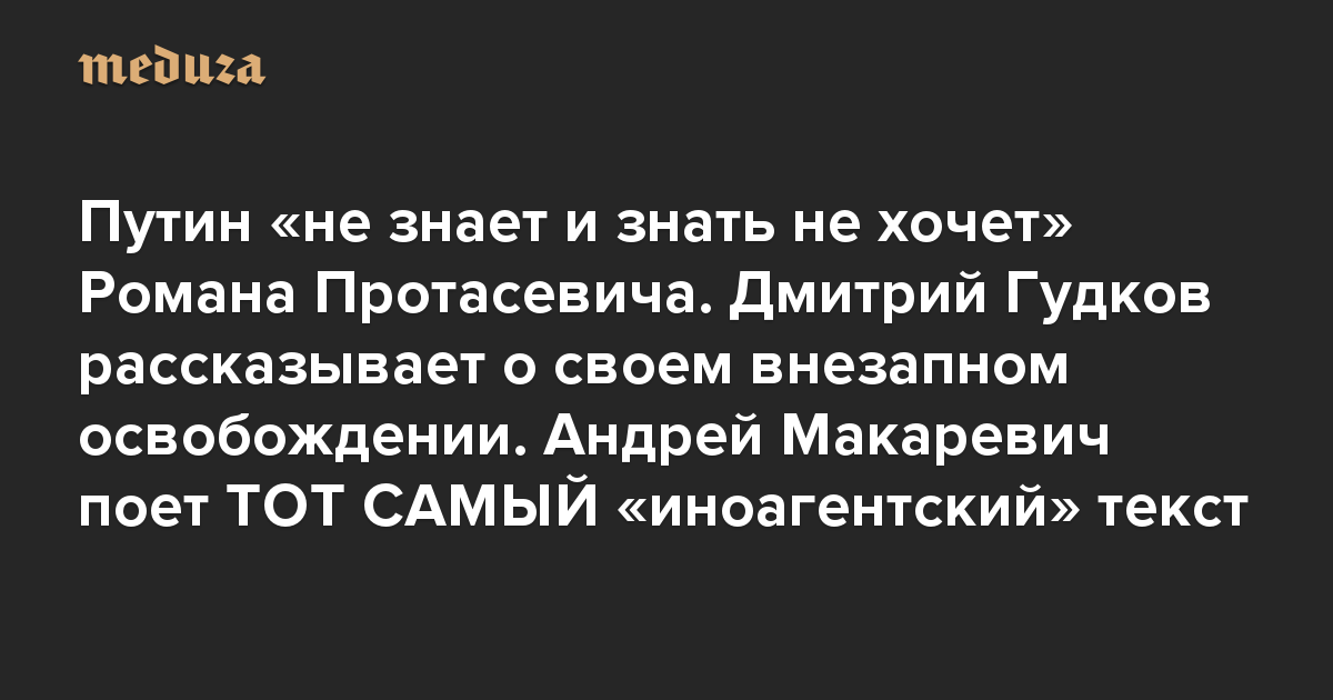 Вечерняя Медуза Путин «не знает и знать не хочет» Романа Протасевича. Дмитрий Гудков рассказывает о своем внезапном освобождении. Андрей Макаревич поет ТОТ САМЫЙ «иноагентский» текст