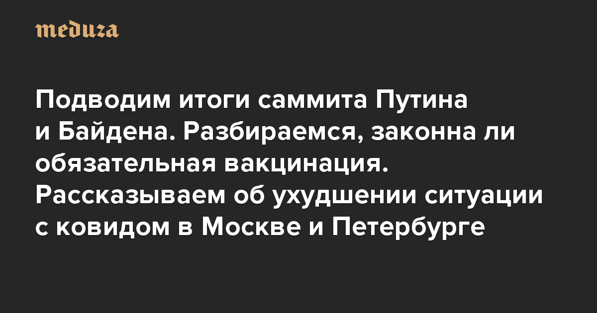 Вечерняя Медуза Подводим итоги саммита Путина и Байдена. Разбираемся, законна ли обязательная вакцинация. Рассказываем об ухудшении ситуации с ковидом в Москве и Петербурге