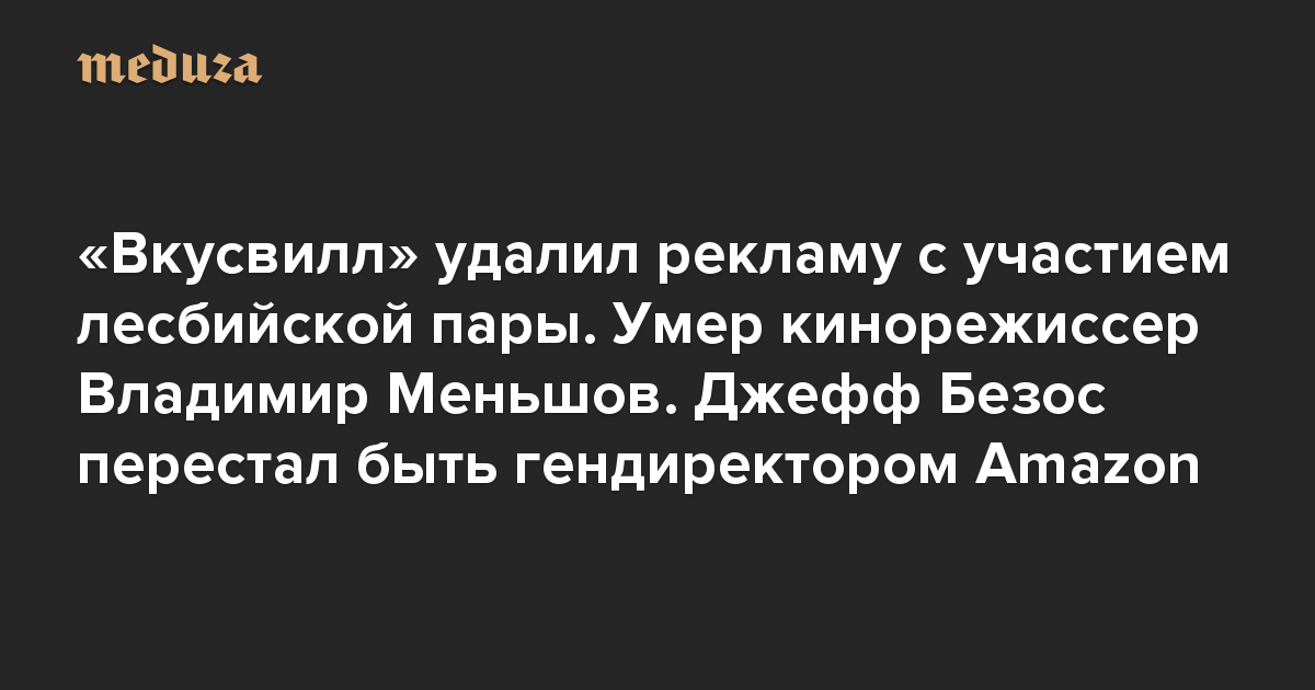 Вечерняя Медуза «Вкусвилл» удалил рекламу с участием лесбийской пары. Умер кинорежиссер Владимир Меньшов. Джефф Безос перестал быть гендиректором Amazon
