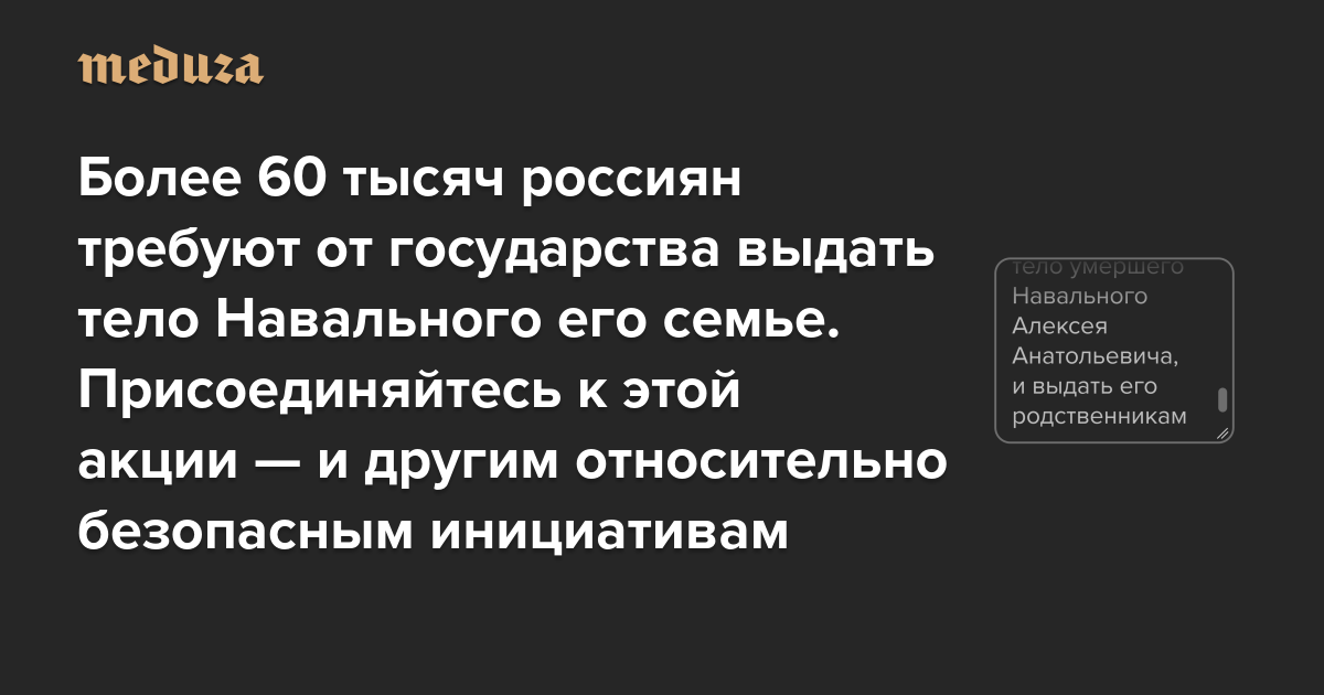 Более 60 тысяч россиян официально требуют от государства выдать тело Алексея Навального его семье. И государство обязано ответить Присоединяйтесь к этой акции — и другим относительно безопасным инициативам (мы собрали их список)
