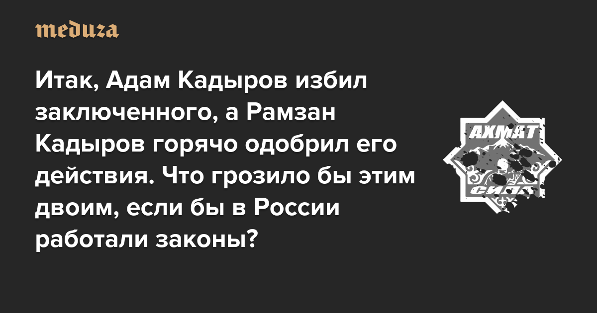 Итак, Адам Кадыров избил арестованного, а Рамзан Кадыров горячо это одобрил. Что грозило бы обоим, если бы в России работали законы? Короткий ответ: сыну немногое, а вот у отца были бы проблемы