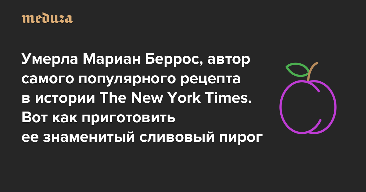 В 2016 году мы впервые рассказали историю про самый популярный рецепт в истории газеты The New York Times и не могли оставить вас без руководства к действию. 20 сентября 2025 года автор рецепта, американская писательница и кулинарный обозреватель Мариан Беррос умерла на 93 году жизни. «Медуза» снова публикует инструкцию, как приготовить ее знаменитый пирог.