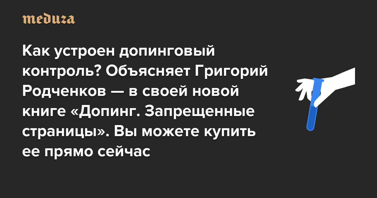 В издательстве «Медузы» вышла книга Григория Родченкова «Допинг. Запрещенные страницы» о системном использовании допинга российскими спортсменами и подмене положительных проб мочи на Олимпиаде в Сочи в 2014 году. Родченков много лет занимался допинговым контролем в СССР, а затем возглавлял Московскую антидопинговую лабораторию вплоть до приостановления ее деятельности в 2015-м. В одной из глав своей книги он объясняет, как устроен допинг-контроль, кто этим занимается и почему антидопинговая система так плохо работает.