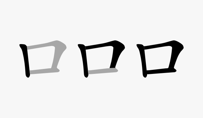 Слева снизу — печатный иероглиф рот. А в центре и справа — тот же иероглиф, написанный от руки в правильном порядке, но быстро.