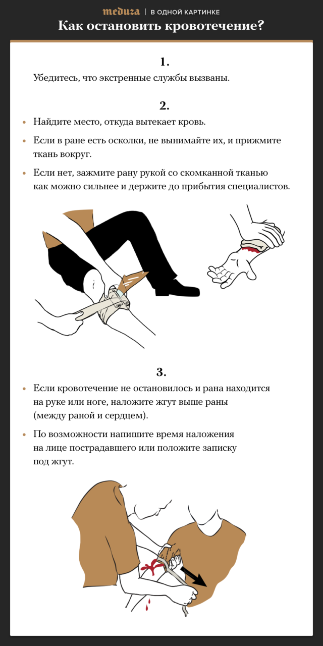 Две наиболее распространенные причины смерти при террористической атаке, которые можно предотвратить, — это потеря крови и перекрытие дыхательных путей. Вы можете предпринять элементарные действия для остановки кровотечения и открытия дыхательных путей. Это намного лучше, чем ничего. Департамент внутренней безопасности США даже запустил кампанию Stop The Bleed, чтобы как можно больше людей узнали о том, как это делается.