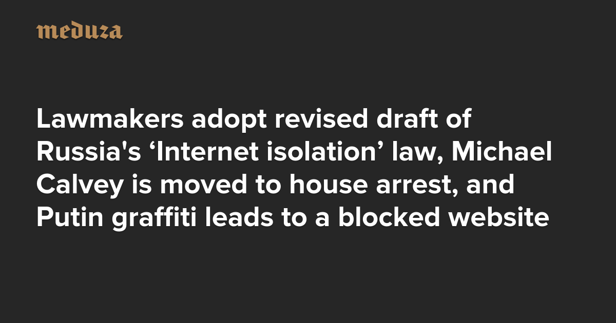 The Real Russia. Today. Lawmakers adopt revised draft of Russia’s ‘Internet isolation’ law, Michael Calvey is moved to house arrest, and Putin graffiti leads to a blocked website