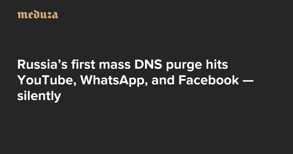 On Tuesday, Russian media reported that YouTube had been completely blocked in Russia after a year and a half of throttling, but Meduza’s investigation reveals that the reality is far messier. While the video platform’s domain disappeared from Russia’s National Domain Name System (DNS) records, the blocking method proved ineffective, with YouTube remaining accessible via alternative DNS servers. Meduza also found that at least 13 other platforms — including WhatsApp, Facebook, and several independent media outlets — were quietly removed from Russia’s National DNS in what appears to be the first documented case of mass DNS record deletion. And the theory that Roskomnadzor deleted YouTube to free up resources for throttling Telegram? There’s no confirmation of that either.
