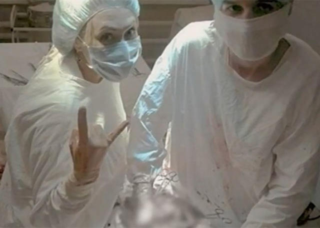At roughly the same time, there was another scandal involving a different nurse in Nizhny Tagil. This nurse, Marina Sharina, posted selfies from an operating room, standing over a patient with an open stomach. In the photo, the operating table is strewn with blood and guts. As a doctor reaches into the patient’s body cavity, Sharina leans into the photo’s frame and makes a devil-horns hand gesture at the camera.
