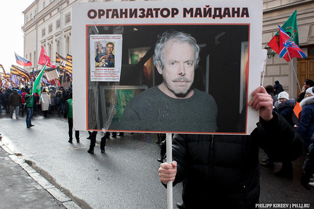 Andrei Bogdanov, the former leader of the Democratic Party of Russia (DPR) and a grand master freemason, also showed up at the Anti-Maidan march. As a pro-Kremlin strategist, Bogdanov has helped create dozens of spoiler political parties. He’s currently busy building up the Communist Party of Social Justice (known as “KPSS”—the same acronym used by the Soviet Communist Party), hoping to take away votes from the Communist Party of the Russian Federation, the country’s number-two party, in the next parliamentary and regional elections.