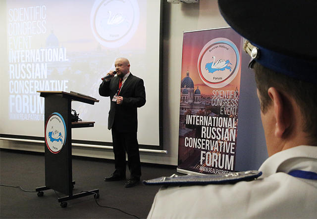 The most pro-Russian speeches were given by Cris Roman from the Belgian movement Euro Russia and Finnish publicist Johan Bäckman. Roman came to the forum wearing a tie with the Russian imperial coat of arms on it, a Russian flag pin on his blazer, and the orange-and-black Ribbon of St. George (which stands for Russian military valor) sticking out of his pocket.