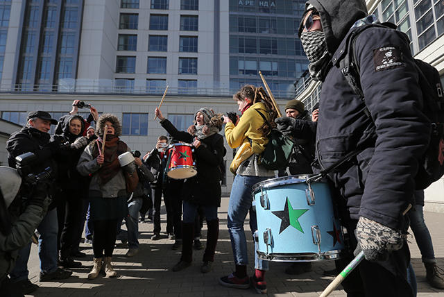 “This is the legitimization of neo-Nazi discourse in the public space. Denial of the Holocaust is becoming a mainstream phenomenon, and the government flirts with it and encourages the emergence of groups like this,” said activist Boris Romanov, who came to the protest with a poster which read “Intruders are overrunning the country.”