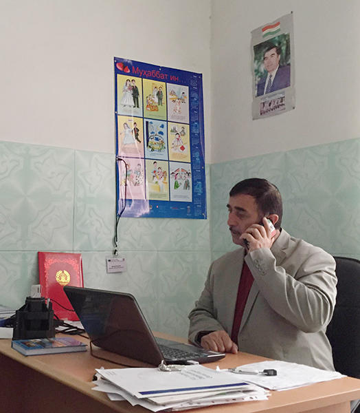 At the beginning of 2015 during a phonecall, Nusrat threatened the editor-in-chief of Paik for publishing photos of Tajik fighters. “He said to me, ‘We’re scary. We cut people’s heads off. We’ll set you all on fire, we’ve got people here,’” Ahmad Ibrohim tells me. In his hand he holds a mobile phone decorated with the Tajikistan flag. Behind him hangs a portrait of President Emomali Rahmon.