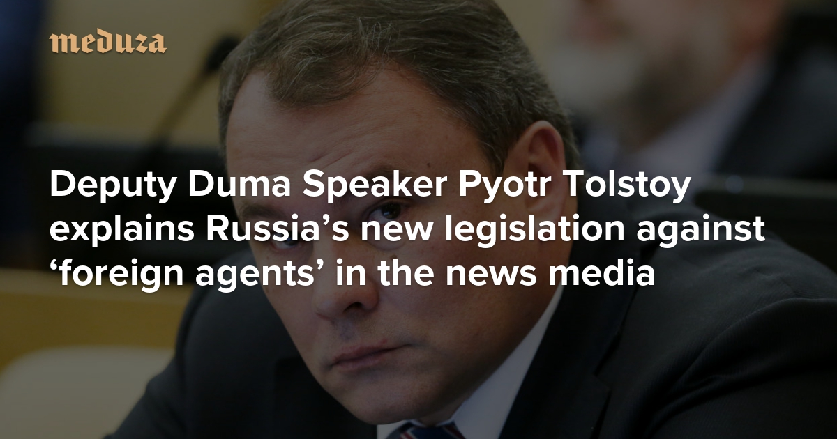 On November 15, lawmakers in the lower house of Russia’s parliament unanimously passed all three readings of amendments to federal laws on the mass media. If adopted by the Federation Council and President Putin, the reforms will empower the Justice Ministry to add certain media outlets to Russia’s registry of foreign agents. State Duma deputies say the legislation is being expedited as a response to the U.S. Justice Department’s recent decision to require the American subsidiary of RT (Russia Today) to register as a foreign agent. Meduza spoke about the amendments with Deputy Duma Speaker Pyotr Tolstoy, who headed the working group that drafted the legislation.