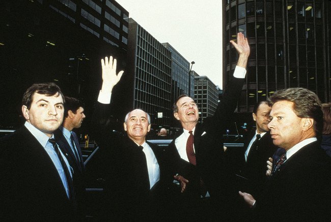 Bush really wanted to ride together with Gorbachev in the car, and at some point, before reaching the White House, Gorbachev says, “Let’s talk to the people.” They stop the car, stop the motorcade, they step out, and there’s this triumphant scene there: people shake their hands, wishing them success. Bush was still vice president, and he was already getting ready to run for the presidency.