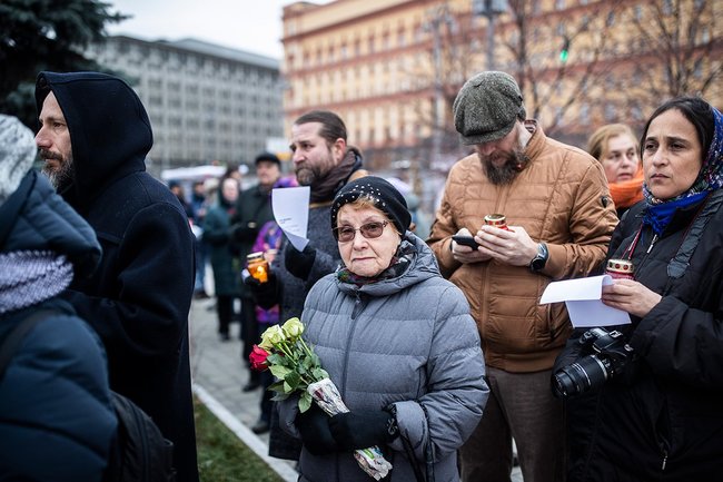 On October 29, Moscow holds its annual “Returning the Names” commemoration at the Solovetsky Stone in Lubyanka Square, across from what used to be the KGB’s headquarters. The monument itself is made up of a large stone from the Solovetsky Islands, from the Solovki Gulag prison camp. Throughout the day, people come to remember and read aloud the names of victims in the Soviet Great Terror.