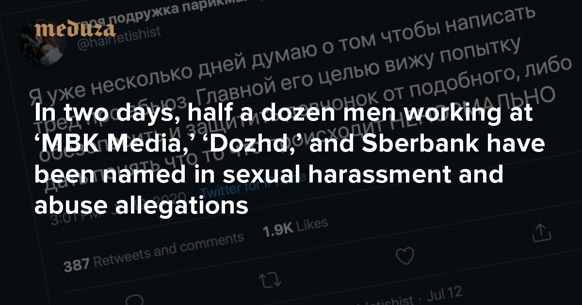 Russia’s #MeToo resurgence In two days, half a dozen men working at ‘MBK Media,’ ‘Dozhd,’ and Sberbank have been named in sexual harassment and abuse allegations