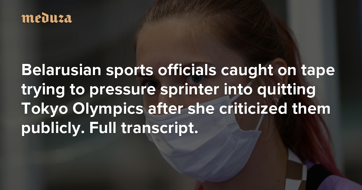 Hours after the dramatic events at Tokyo’s airport, the anonymous Telegram channel “Nick and Mike” published an audio recording on YouTube that allegedly captures an exchange between Tsimanouskaya and two Belarusian sports officials: national team head coach Yuri Moisevich and Belarusian Republican Track and Field Training Center deputy director Artur Shumak. About 19 minutes long, the tape is clearly part of a conversation where the two men drive Tsimanouskaya to tears, trying to persuade her to drop out of the Olympics and leave Tokyo immediately. Meduza presents a translation of this recording (with a few minor redactions).