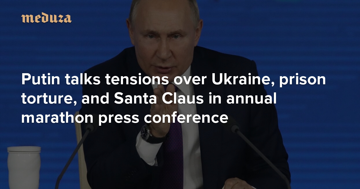 Vladimir Putin held his yearly marathon press conference for the seventeenth time on Thursday, December 23. Around 500 journalists were invited to attend; the Russian president fielded 55 questions in just under four hours, taking few questions from the foreign press and no questions from the “foreign agent” media outlets present (Meduza included). Putin commented on a number of pressing issues, including tensions with the U.S. and NATO over Ukraine, this past year’s crackdown on dissent, systemic abuse in the Russian prison system, and, in the holiday spirit, his feelings about Santa Claus. Meduza sums up the key takeaways here.