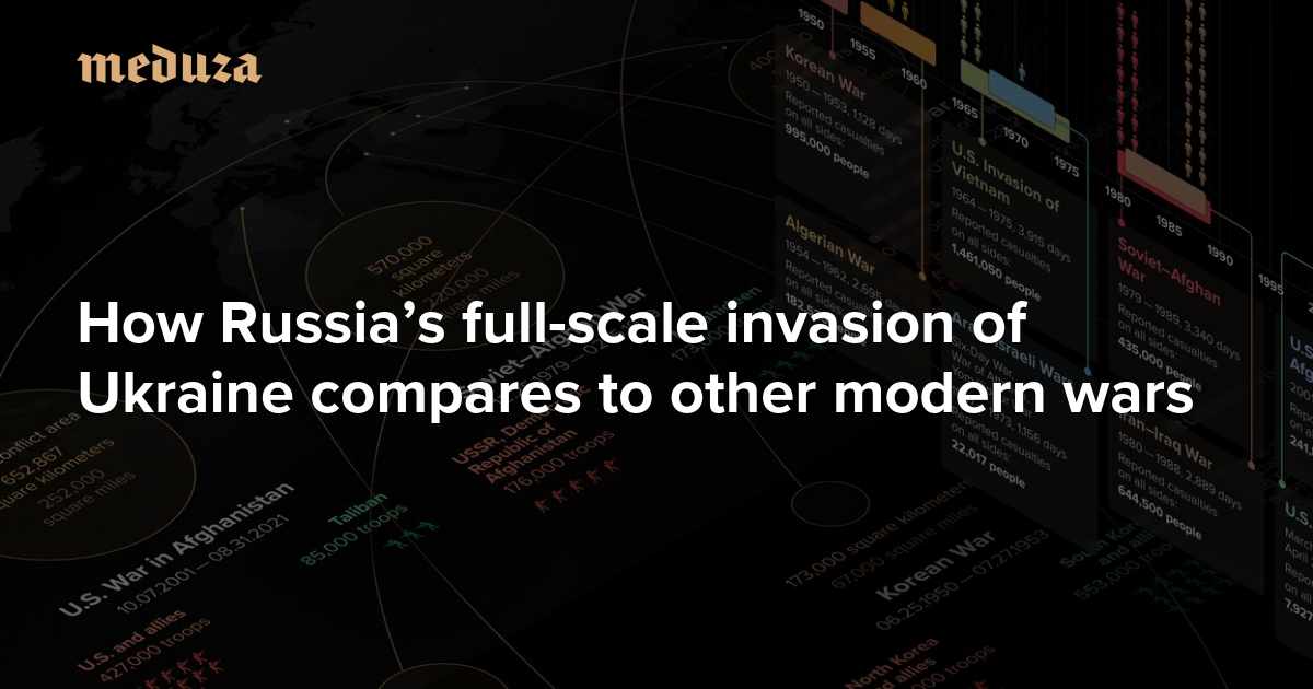 August 24 marks exactly six months (182 days) since the start of Russia’s full-scale invasion of Ukraine. While the war appears far from over, the size of the territory it affects and the number of troops involved have already made it comparable to many of the most well-known and politically significant conflicts of the last seventy years. Relatively speaking, the war’s death toll is still low, but it’s not guaranteed to stay that way — especially as it settles into a war of attrition. To better understand the invasion in a historical context, Meduza compared the best data we have on it to data from eight other modern interstate conflicts.