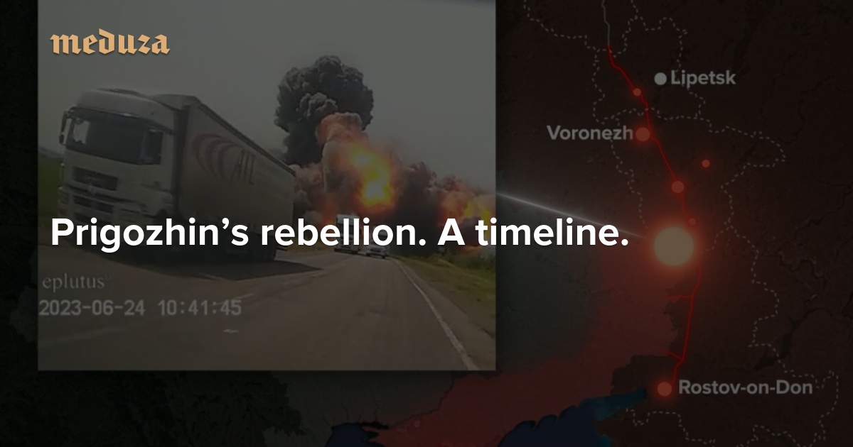 On the evening of June 23, Wagner Group founder Yevgeny Prigozhin began his rebellion. Wagner units entered Rostov-on-Don. Prigozhin announced a “march of justice” to Moscow. Wagner mercenaries covered several hundred miles, meeting little to no resistance on the ground, and shooting down several military helicopters, as well as an Il-22M airplane. On the evening of June 24, after talks with Alexander Lukashenko, Prigozhin announced that the mercenaries would be returning to their camps “according to the plan.” Meduza has reconstructed a timeline of these historic events.