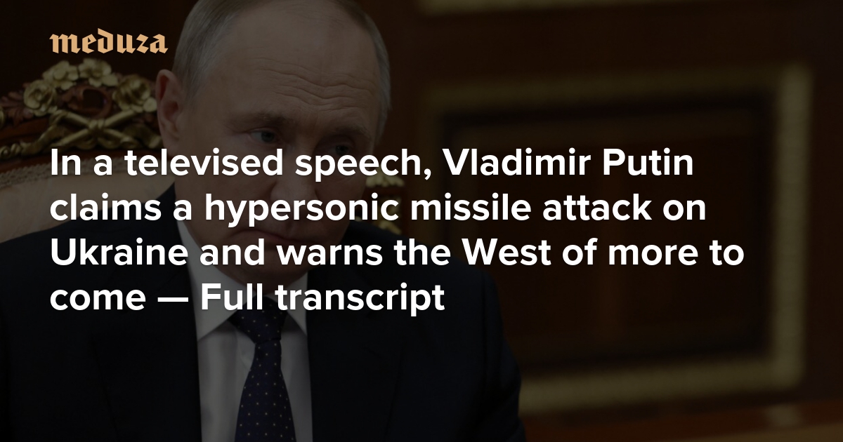 In a televised national address on Thursday, Vladimir Putin informed Russians and the world that he ordered a ballistic missile strike on a weapons factory in Ukraine in retaliation for U.S. and U.K. authorization (and alleged operational support) for longer-range attacks against targets inside Russia by Kyiv using American and British missiles. In his remarks, Putin denounced Washington’s weapons deployments, vowed to continue using ballistic missiles in response, and took the opportunity to praise Russian rocket science. Meduza translated the president’s address in full.