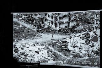 Hrysha scrolls through videos on his phone — clip after clip of so-called “drops.” A grenade falls from above on some “fuckers” moving through the treeline. There’s a small blast; a soldier collapses, curls up on the ground, and dies. Hrysha scrolls to another clip — a dog gnawing on a skeleton. The arms are gone. The skull just dangles.