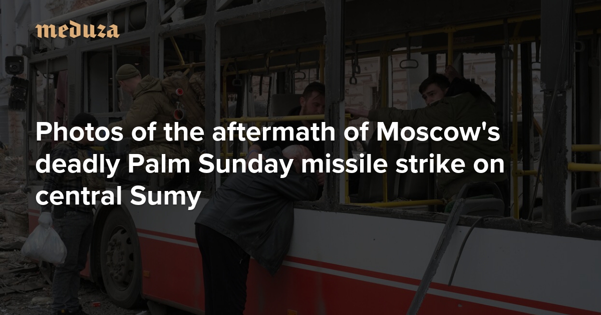 On April 13 — Palm Sunday — Russian forces launched a missile strike on the Ukrainian city of Sumy. According to the latest reports, 35 people were killed, including two children. At least 129 others were injured. Ukrainian President Volodymyr Zelensky said that Russian troops fired two missiles at the city. The first hit a university building, and the second exploded over a street. “Only scum could do something like this — taking the lives of ordinary people,” Zelensky said. Ukraine's National Police also condemned the attacked, saying, “Once again, Russia has brought death,” and calling it “a day of pain and deep mourning” for the entire country. Meduza publishes photos of the strike's aftermath.