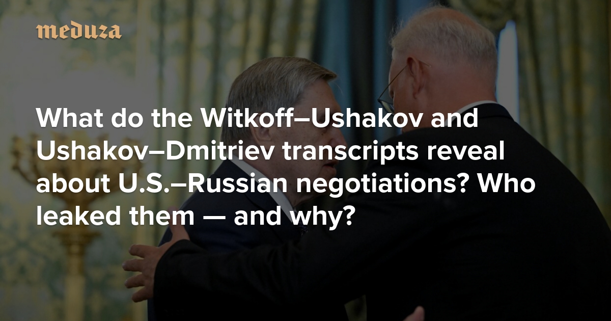 On November 25, Bloomberg published an explosive report containing transcripts of two phone calls: one between top Kremlin advisers Yuri Ushakov and Kirill Dmitriev, and another between Ushakov and U.S. presidential special envoy Steve Witkoff. The leak revealed that Witkoff coached Ushakov on how to communicate with Trump, while Dmitriev provided Washington with a list of Russia’s conditions for initiating a peace settlement with Ukraine. Meduza tackles the two biggest questions in this story: What did we learn from the transcripts? And who could have leaked them?