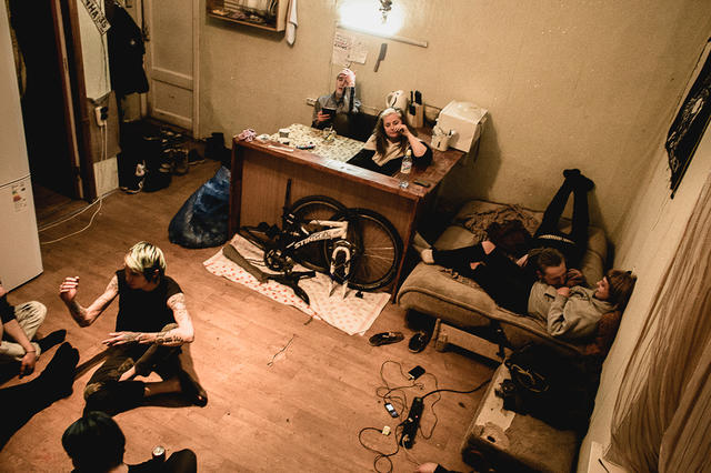 After a concert, a group hangs out in somebody’s rented room in a communal apartment complex. Many punks from out of town rent rooms in communal apartments, built in St. Petersburg during the Soviet era. It’s some of the cheapest housing available in the city today.