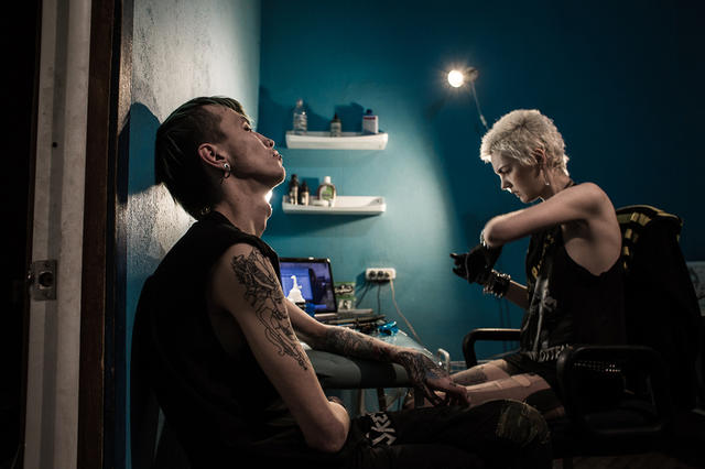 Sasha “Tsoi” (after the beloved Soviet rock pioneer Viktor Tsoi) is adding to his forearm a tattoo copied from a photograph of American punk artist John John Jesse. Tsoi calls the design “Sins of a Generation.” “More people don’t think about anything at all. They listen to the music, they get the haircuts, and they walk around and hang out like that for like seven goddamn years. And then they’re done. But the handful that remains will carry on the ideas of anarchism, and keep up the protests. And I know we’re not going to do shit, and that our kids aren’t going to do shit, and that our kids’ kids aren’t going to do shit—and that there’s no use rocking the boat, because if it tips and we’re all stranded, we’ll fucking eat each other. And then the whole world will just go up in flames from global capitalism and the fact that nobody gives a single fuck.” –Tsoi