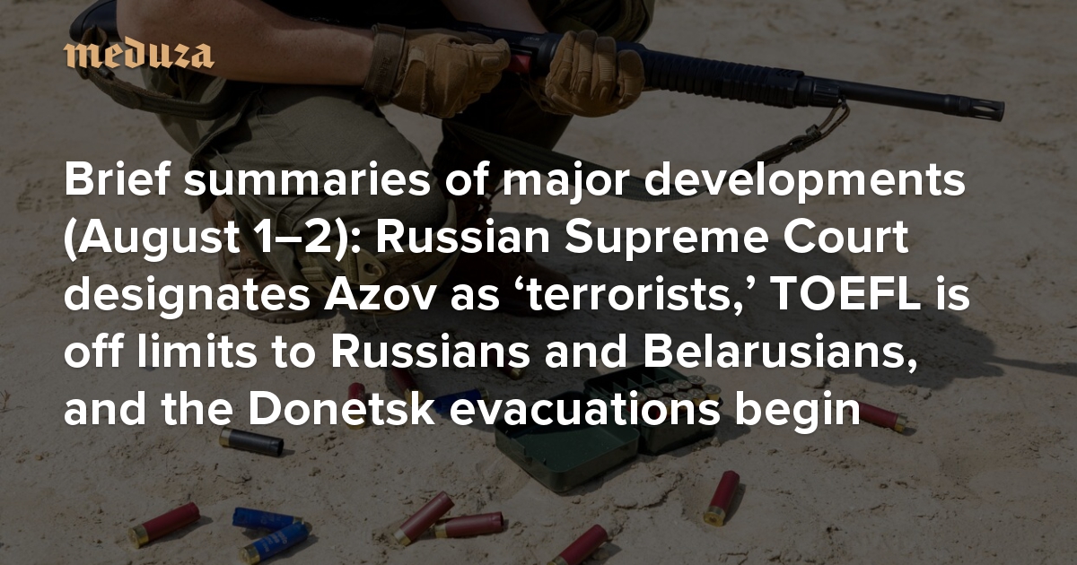 News Feed Brief summaries of major developments (August 1–2): Russian Supreme Court designates Azov as ‘terrorists,’ TOEFL is off limits to Russians and Belarusians, and the Donetsk evacuations begin
