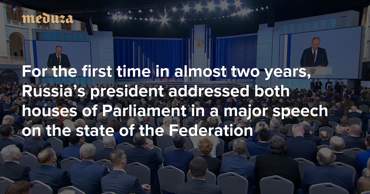 On Tuesday, February 21, 2023, Vladimir Putin addressed both houses of Russia’s Parliament. Meduza covered the speech’s main points in this live blog. You can watch the Russian-language feed yourself here.