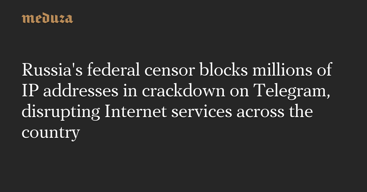 Russia's federal censor blocks millions of IP addresses in crackdown on Telegram, disrupting Internet services across the country